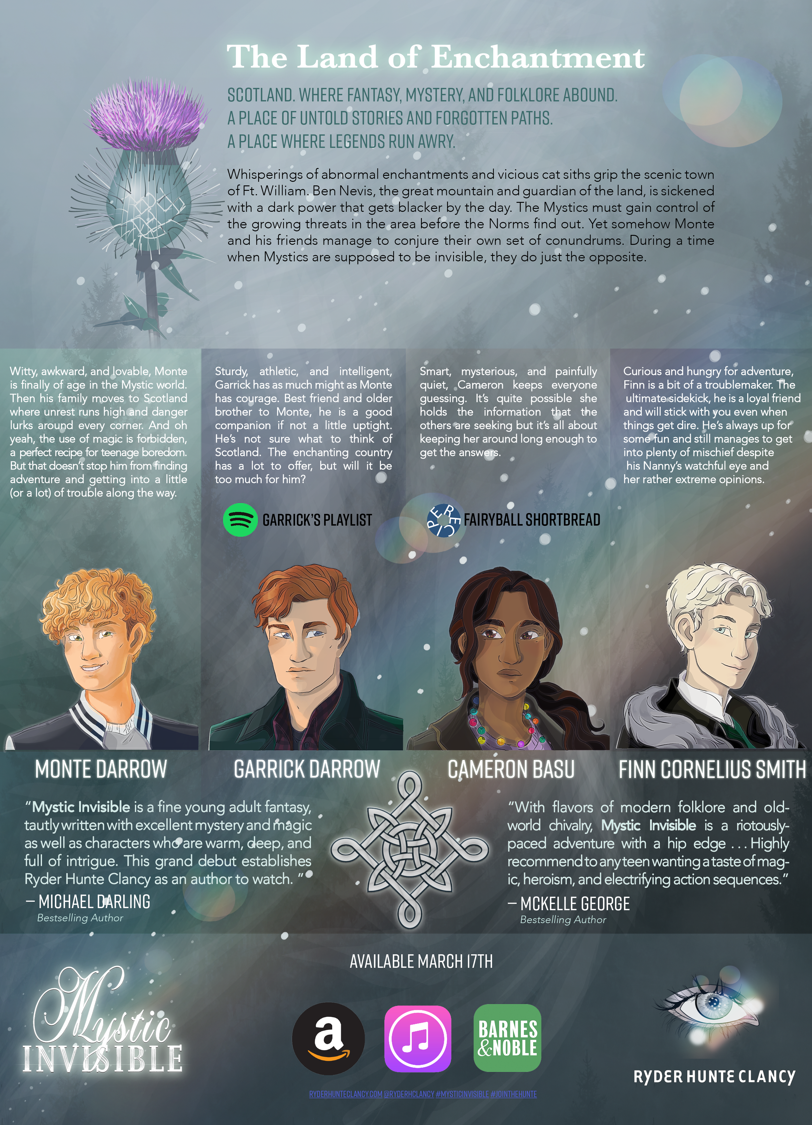 ​Witty, awkward, and lovable, Monte is finally of age in the Mystic world. Then his family moves to Scotland where unrest runs high and danger lurks around every corner. And oh yeah, the use of magic is forbidden, a perfect recipe for teenage boredom. But that doesn’t stop him from finding adventure and getting into a little (or a lot) of trouble along the way.